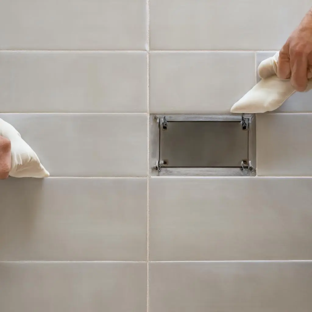- Planen Sie das Fugenraster so, dass die Drückerplatte im Idealfall innerhalb einer Fliese liegt oder die Fuge bündig über die Kanten der Öffnung geführt wird. Ein kontinuierliches Raster lässt die Revisionseinheit praktisch verschwinden.